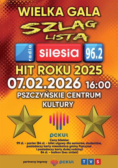 7 lutego 2026r. w pckulu podczas koncertu na żywo dokonamy wyboru hitu roku Szlag Listy Radia Silesia. To wyjątkowy i jedyny taki wieczór. Szalona zabawa, mnóstwo emocji i niezapomniane wrażenia. Na scenie parunastu Artystów śląskiej sceny muzycznej. To będzie WIELKA GALA SZLAG LISTY!