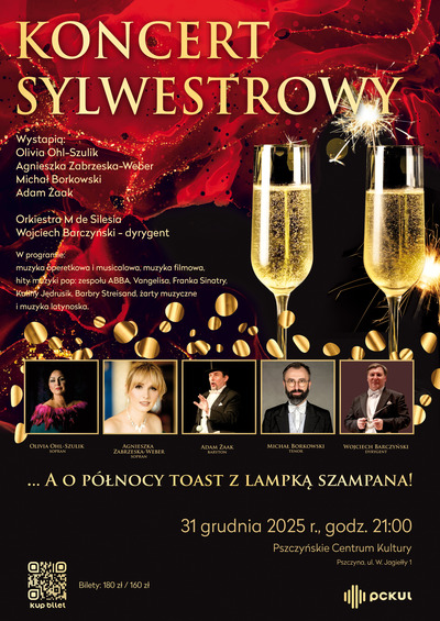 Sylwestrowe odliczanie do Nowego Roku spędzimy przy muzyce miłej dla ucha, znanej, lubianej i tworzącej wspomnienia. Program koncertu obejmuje muzykę operetkową z najpiękniejszymi polkami, czardaszami, ariami i duetami Johanna Straussa, Emmericha Kalmana, Franciszka Lehara i Jacquesa Offenbacha, muzykę musicalową z uwielbianymi przebojami z nieśmiertelnych musicali – jak np. „Skrzypek na dachu” czy „My fair Lady”, muzykę filmową w ujęciu wręcz niespodziewanym (ale niech to będzie niespodzianka) oraz hity muzyki popularnej, m.in. zespołu ABBA, Franka Sinatry, Kaliny Jędrusik czy Barbry Streisand, a nawet Vangelisa. Nie zabraknie oczywiście gorących rytmów latino, a także wymyślnych żartów muzycznych, aby nastrój w ten wyjątkowy wieczór był jak najwspanialszy.